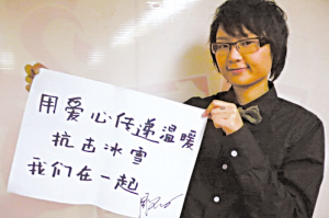 一場(chǎng)由中國(guó)曲藝家協(xié)會(huì)發(fā)起組織的“愛(ài)心化冰雪 真情暖人間——曲藝界抗冰雪賑災(zāi)大義演”慈善活動(dòng),將于2月5日晚19:30在北京民族宮大劇院舉辦。曲藝界同仁紛紛主動(dòng)提出進(jìn)行賑災(zāi)演出,陜西快板名家張保和趕寫(xiě)趕排新節(jié)目,主辦單位之一的中國(guó)廣播藝術(shù)團(tuán)為演出無(wú)償提供舞美、燈光、音響,民族宮大劇院為演出提供場(chǎng)地,北京人民廣播電臺(tái)作為協(xié)辦單位為義演滾動(dòng)播發(fā)消息,著名演員姜昆、李金斗、鞏漢林、金珠、鞠萍、李揚(yáng)等人不僅無(wú)償演出,而且還要在晚會(huì)現(xiàn)場(chǎng)捐款。據(jù)悉,主辦單位會(huì)在演出后,將所有演出收入、善款送給有關(guān)部門(mén)。