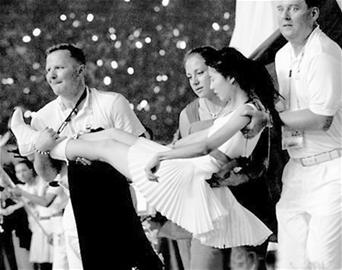 值得一提的是,當晚,有位白衣姑娘因透支體力而昏厥。在網(wǎng)上,一張照片記錄了這一幕:一位白衣MM不省人事,左手因抽筋痙攣而僵硬。讓人感動的是,這位姑娘暈倒在地后,第一時間抱起她的,是一位美麗的外國女運動員,兩旁還有兩位身穿白衣的外籍工作人員,一人托住她的腳,一人扶住她的頭,面露焦急,奔跑著,將姑娘送下場。這一幕,感動了無數(shù)網(wǎng)友,紛紛感謝這3位外國友人的熱心,并急切地搜索著他們的資料!罢嬲\的國際友誼!為這樣的和諧、友好鼓掌!”有網(wǎng)友在網(wǎng)上發(fā)了無數(shù)個“謝謝”來表達無法表達的謝意。