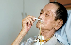 因為長期抽煙,范老的肺不是很好。住院以后,由于長期不活動,抵抗力下降,肺部受到感染。今年2月份,醫(yī)院為范老實施了氣管切開術。