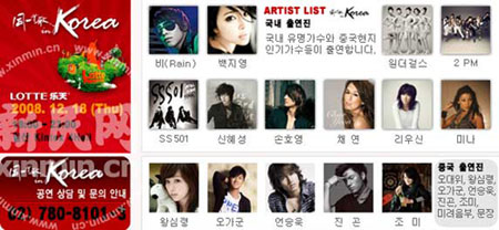 新民網(wǎng)記者從《同一首歌in korea》的官方網(wǎng)站了解到,此次參加該晚會的名單分“韓國演出者”與“中國演出者”。韓方派出申慧星、Rain、蔡妍等藝人,中方參加的包括趙薇、陳坤、言承旭、王心凌等人。