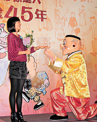 中新網(wǎng)1月12日電 陳法拉昨日走進經(jīng)典漫畫世界,化身為經(jīng)典卡通人物陳小姐,與老夫子及大蕃薯齊齊現(xiàn)身在青衣舉行的“帶你進入老夫子黃金45年”展覽。
