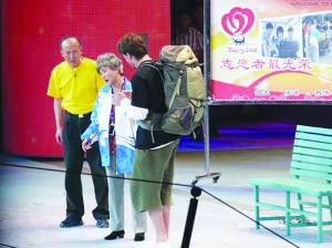 情節(jié):北京奧運(yùn)會(huì)期間,蔡明十分羨慕志愿者。她遇見了穿著志愿者服的郭達(dá),于是纏著他,要跟他一起幫助來北京的客人。兩人遇見了急著找?guī)捻n國小伙子,因?yàn)槁牪欢』镒诱f啥,折騰了半天才明白過來,直把小伙子急得捂著小腹,滿地亂跳。接著兩人遇見了迷路的美國小伙子。美國小伙子只會(huì)說簡單的中文,郭達(dá)只會(huì)說Welcome to beijing這么一句外語,于是又是一陣瞎鬧騰。蔡明指手畫腳,希望用肢體語言讓小伙子明白各種地名,但越搞越亂。此時(shí),真正的志愿者上場,原來郭達(dá)只是穿了人家晾在外面的志愿者服。蔡明、郭達(dá)失落之時(shí),遇見走失了新郎的新娘,兩人想盡辦法幫她找到了新郎,十分高興,最后大家邊為觀眾發(fā)喜糖邊退場,喜氣十足。
