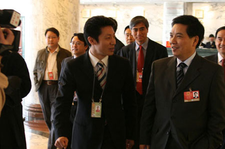 點(diǎn)評:棕色西服的設(shè)計(jì)和顏色不是很好,領(lǐng)子設(shè)計(jì)得不好,使得衣服線條下垂,十分顯老。而且,里邊的襯衣領(lǐng)子翻出來,顯得很累贅。不過,這種素氣的著裝比較符合兩會(huì)嚴(yán)肅的氛圍。