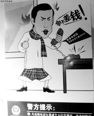 昨日,記者在一論壇看到,小沈陽(yáng)《不差錢》的形象上了警方發(fā)出的告示,告示上的“小沈陽(yáng)”怒吼“咱不差錢”。警方提示語(yǔ)稱:“凡是稱電話欠費(fèi)或個(gè)人信息泄露,涉及財(cái)物的陌生來(lái)電一律不要理睬!如有疑問請(qǐng)撥打110!”而落款則是上海市公安局某分局。記者 楊萬(wàn)亮