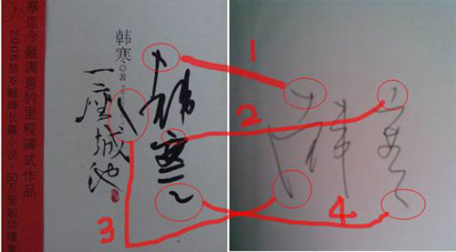 此外,該網(wǎng)友還拿出親自排隊(duì)得到的韓寒親筆簽名及網(wǎng)友貼的從韓寒淘寶店買(mǎi)來(lái)的簽名,分析其筆跡,該網(wǎng)友斷言,韓寒賣(mài)書(shū)的簽名都是韓爸爸或其他人代簽的。