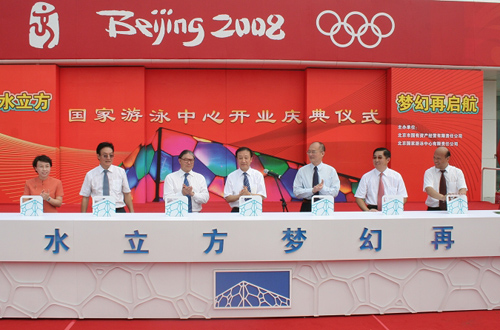 北京市副市長(zhǎng)程紅在慶典中致辭。北京市委常委、統(tǒng)戰(zhàn)部部長(zhǎng)牛有成宣布“國(guó)家游泳中心完成賽后改造,現(xiàn)重新對(duì)外開(kāi)放”。隨后,中央及北京市有關(guān)領(lǐng)導(dǎo)、捐資人代表共同為水立方開(kāi)啟“全新水立方 夢(mèng)幻再啟航”的大門,水立方以嶄新的形象展現(xiàn)在社會(huì)公眾面前。參加慶典的領(lǐng)導(dǎo)隨后參觀了水立方場(chǎng)館,并出席了在水立方內(nèi)舉辦的“港澳臺(tái)同胞海外華僑華人支持北京2008奧運(yùn)會(huì)紀(jì)念展揭幕儀式”。