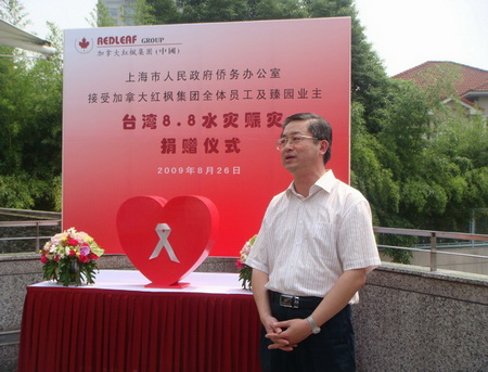 8月26日上午,上海市政府僑辦接受加拿大紅楓集團(tuán)向臺(tái)灣受災(zāi)地區(qū)捐贈(zèng)儀式在臻園別墅舉行。加拿大紅楓集團(tuán)董事長(zhǎng)周正寬先生、馬絢華女士代表集團(tuán),通過(guò)上海市政府僑辦向臺(tái)灣受災(zāi)地區(qū)捐款人民幣30萬(wàn)元。副總經(jīng)理丁道恒等代表全體員工捐款人民幣1.7余萬(wàn)元。臻園別墅業(yè)主也在活動(dòng)現(xiàn)場(chǎng)進(jìn)行了捐款。上海市政府僑辦主任崔明華出席活動(dòng)并講話(huà)。