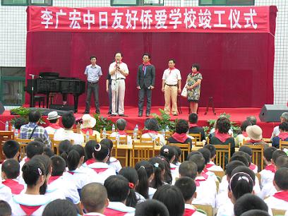 張繼勇在致辭中說,李廣宏先生情系四川、心系災(zāi)區(qū)。去年“5.12” 汶川特大地震發(fā)生后,李廣宏率日本友人五次來川,多次為災(zāi)區(qū)學(xué)生舉行演唱會,用歌聲撫慰災(zāi)區(qū)學(xué)生受傷的心靈。后又拿出積蓄52.5萬元人民幣,在災(zāi)區(qū)捐建“李廣宏中日友好僑愛學(xué)校綜合樓”。今天,在各方面共同努力下,綜合教學(xué)樓終于建成了,我代表省僑辦對此表示熱烈祝賀,對李廣宏先生及日本友人的到來表示熱烈歡迎和衷心感謝。他希望學(xué)校師生搞好教學(xué),發(fā)奮勤學(xué),為實現(xiàn)四川省“兩個加快”努力工作,以優(yōu)異成績迎接建國60周年到來。