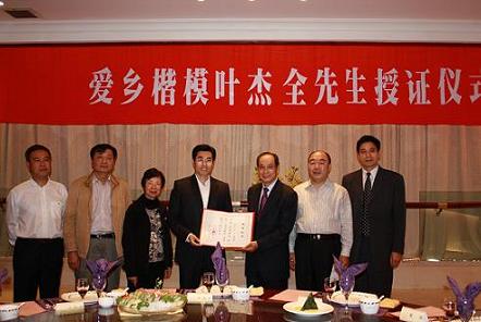 為表彰葉杰全先生重教興學(xué)、無償捐贈的義舉,2007年10月,浙江省人民政府授予葉杰全“愛鄉(xiāng)楷模”榮譽稱號。(浙江僑辦 左新元)