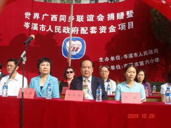 岑溪市“世界廣西同鄉(xiāng)聯(lián)誼會(huì)僑愛小學(xué)”新建教學(xué)樓項(xiàng)目位于岑溪市第六小學(xué),于2009年4月動(dòng)工,由世界廣西同鄉(xiāng)聯(lián)誼會(huì)捐贈(zèng)30萬港元,岑溪市人民政府配套資金建成。受世界廣西同鄉(xiāng)聯(lián)誼會(huì)委托,自治區(qū)僑辦負(fù)責(zé)該項(xiàng)目的組織、督建和落實(shí)工作。作為廣西區(qū)“僑愛工程”項(xiàng)目之一,岑溪市第六小學(xué)樹起了“世界廣西同鄉(xiāng)聯(lián)誼會(huì)僑愛小學(xué)”的牌子。