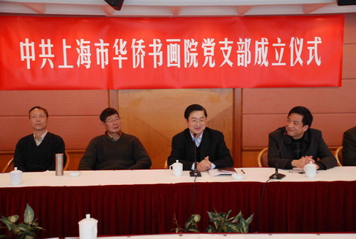 上海市僑辦主任、黨組書(shū)記崔明華出席并講話。他高度評(píng)價(jià)了華僑書(shū)畫院的書(shū)畫家們?cè)诤霌P(yáng)中華優(yōu)秀傳統(tǒng)文化、熱衷社會(huì)公益事業(yè)等方面作出的積極貢獻(xiàn),向加入書(shū)畫院黨組織的黨員書(shū)畫家們表示熱誠(chéng)地歡迎。