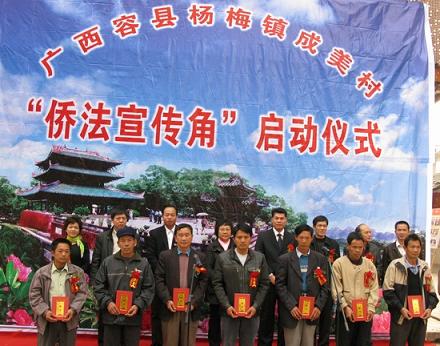 “僑法宣傳角”是國務(wù)院僑辦開展“五五”普法、宣傳《中華人民共和國歸僑僑眷保護(hù)法》及其實(shí)施辦法的一項(xiàng)重要舉措。玉林市外事僑務(wù)辦積極推薦并爭(zhēng)取到在楊梅鎮(zhèn)成美村設(shè)立“僑法宣傳角”。成美村有人口4000多人,有歸僑僑眷3600多人、海外僑胞4280多人,有僑屬企業(yè)2家。該村黨總支部、村委會(huì)辦公設(shè)施先進(jìn),功能室健全,每天到村辦事、開會(huì)、讀報(bào)、學(xué)技術(shù)、娛樂的人員均有百人以上,并重視宣傳僑法、維護(hù)歸僑僑眷的合法權(quán)益,聘請(qǐng)了27位村民小組長、村民代表為“僑法宣傳角”義務(wù)宣傳服務(wù)員。在這里設(shè)立“僑法宣傳角”,有利于廣泛深入地開展僑法集中宣傳活動(dòng),加大僑法宣傳貫徹落實(shí)力度,進(jìn)一步營造愛僑、護(hù)僑、惠僑的良好社會(huì)環(huán)境。