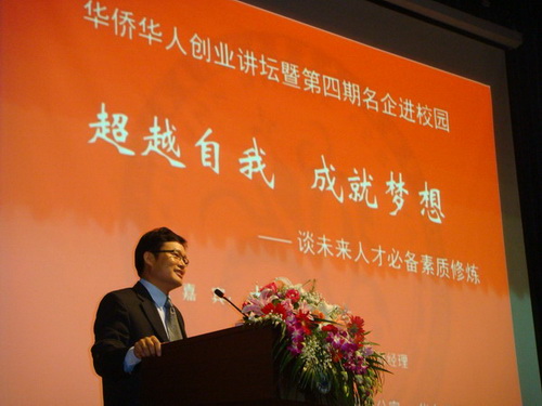 中新網(wǎng)12月30日電 據(jù)上海市僑辦消息,近日,由上海市僑辦與華東理工大學(xué)共同主辦的“華僑華人創(chuàng)業(yè)講壇”第三講在華東理工大學(xué)逸夫樓舉行。本次講壇特邀英特爾公司中國執(zhí)行董事、總經(jīng)理戈峻博士作主題為《超越自我,成就夢想――談未來人才必備素質(zhì)修煉》的精彩報(bào)告,并與華東理工大學(xué)師生互動交流。