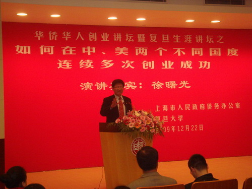 中新網(wǎng)12月31日電 據(jù)上海市僑辦消息,12月22日晚上,上海市復(fù)旦大學(xué)光華樓102報(bào)告廳里座無虛席,由上海市僑辦與復(fù)旦大學(xué)共同主辦的“華僑華人創(chuàng)業(yè)講壇”第四講活動舉行。
