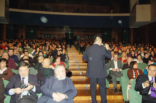 接著,由空軍政治部文工團(tuán)組成的“親情中華”藝術(shù)團(tuán)的藝術(shù)家們?yōu)榇蠹冶硌萘司实奈膴使?jié)目,龐妮娜和楊帥表演的舞蹈令觀眾耳目一新,特別是他們所表現(xiàn)出來的扎實(shí)的基本功令在場的意大利觀眾驚嘆不已;當(dāng)田毅走上觀眾席,“真朋友”的歌聲在每個(gè)人的身邊響起時(shí),懂中文的觀眾向意大利友人傳遞著友情。梁召今獨(dú)唱的意大利語民歌“我的太陽”一曲震驚全場,掌聲如雷。