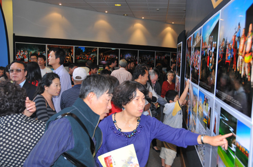 演出前,“文化中國(guó)•四海同春”大洋洲藝術(shù)團(tuán)團(tuán)長(zhǎng)、國(guó)務(wù)院僑辦副主任趙陽(yáng)在劇場(chǎng)外大廳為《中華民族全家!穲D片展剪彩。一幅幅圖片展示著中國(guó)56個(gè)民族多姿多彩的文化生活。基督城僑胞們或駐足欣賞,或興奮地向周邊朋友細(xì)說(shuō)自己在中國(guó)的所見所聞。