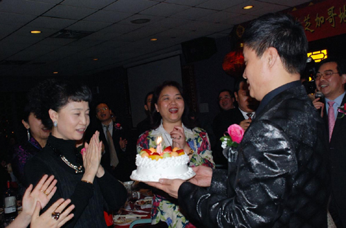 在歡迎宴會上,許又聲在總領(lǐng)事黃屏陪同下,向參加宴會的每一桌僑胞一一敬酒,向大家致以親切問候。來賓們和閻維文、夢鴿、陳軍、劉珂、雷佳、劉小娜等藝術(shù)家們爭相合影,歡聲笑語不斷。當天正值閻維文的夫人劉衛(wèi)星生日,大會特地準備了生日蛋糕,全場合唱“祝你生日快樂”。閻維文也清唱一首“在那遙遠的地方”來感謝大家,受到熱烈的歡迎。
