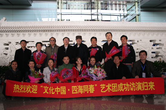 中新社北京3月9日電 (南若然)結束在南美四國23天的慰僑巡演之后,9日下午,“文化中國·四海同春”赴南美洲藝術團載譽返回北京。該團團長、國務院僑辦副主任馬儒沛在首都機場接受中新社記者采訪時表示,赴南美巡演“鵬程數(shù)萬里,廣交四方友,笑迎八面風,演繹中華情”,并創(chuàng)造了四個之最。