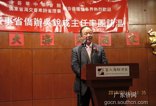 宴會上,中華會館等主要社團(tuán)的負(fù)責(zé)人、海外理事代表紛紛做了熱情洋溢的歡迎辭,對廣東省僑辦主任吳銳成一行務(wù)實(shí)、深入、高效、不辭勞苦的工作表示由衷的欽佩和贊賞。吳銳成在發(fā)言中感謝僑胞們對訪問團(tuán)的熱情接待和大力支持;向僑胞們詳細(xì)介紹了這次訪問的目的,一是向僑胞們拜年,二是報(bào)告中國特別是廣東的社會經(jīng)濟(jì)發(fā)展情況,三是感謝僑胞們對中國以及廣東發(fā)展所作的貢獻(xiàn),四是聽取僑胞的意見;再次表示今后廣東省僑辦要在關(guān)注華僑華人生存發(fā)展、維護(hù)華僑華人合法權(quán)益、支持社團(tuán)的革新與發(fā)展、支持華僑華人融入主流社會、支持華社開展華文教育、傳承中華文化等方面做更多的工作。吳銳成務(wù)實(shí)為僑、熱情洋溢的精彩發(fā)言得到了共鳴,贏得了陣陣掌聲。