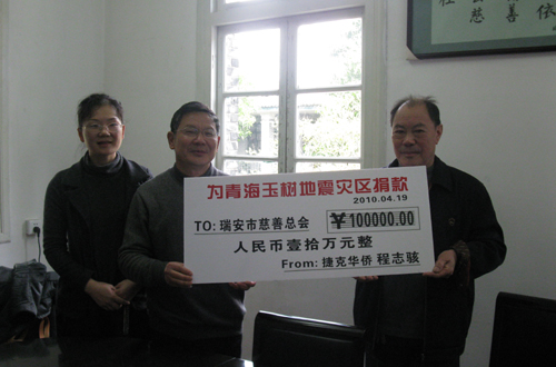 中新網(wǎng)4月20日電 據(jù)瑞安市僑聯(lián)消息,青海玉樹縣的地震震撼了每個中國人,也揪緊了千里之外瑞安僑胞的心。4月19日凌晨5時多,浙江省瑞安市寧益鄉(xiāng)僑聯(lián)主席吳勝運接到瑞安籍捷克僑領(lǐng)程志駭?shù)碾娫,說自己有一筆10萬元的玉樹賑災(zāi)捐款將由他的岳父葉余積轉(zhuǎn)交給瑞安市僑聯(lián)。