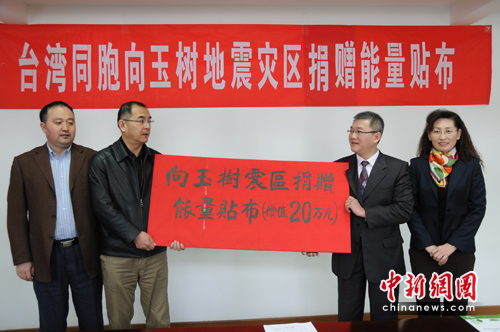 中新網(wǎng)北京4月28日電(記者 張冬冬)臺(tái)灣通德興業(yè)股份公司董事長陳前芳28日在此間向中國華僑經(jīng)濟(jì)文化基金會(huì)捐贈(zèng)價(jià)值20萬元人民幣的能量貼布,用以支援青海玉樹抗震救災(zāi)。