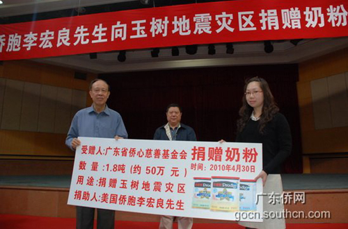 中新網(wǎng)5月4日電 據(jù)廣東僑網(wǎng)消息,玉樹(shù)災(zāi)情牽動(dòng)廣大海外僑胞、港澳同胞的心。在獲悉青海玉樹(shù)地區(qū)發(fā)生7.1級(jí)強(qiáng)烈地震的消息后,美國(guó)僑胞、南加州潮州會(huì)館會(huì)長(zhǎng)李宏良先生立即決定通過(guò)廣東省僑心慈善基金會(huì)向玉樹(shù)災(zāi)區(qū)捐贈(zèng)1.8噸奶粉,價(jià)值約50萬(wàn)元人民幣,以幫助玉樹(shù)災(zāi)區(qū)的孩子渡過(guò)難關(guān)。