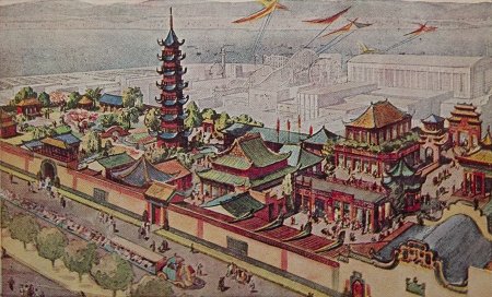 根據(jù)有關(guān)資料,“中國(guó)村”入口大門是一座巨大的牌坊,上面書(shū)寫(xiě)著“華商展覽場(chǎng)”幾個(gè)大字!爸袊(guó)村”內(nèi)設(shè)有兩個(gè)酒家、兩座戲院、一座神廟和一座七層高的佛塔!胺鹚侵袊(guó)村內(nèi)最高建筑!眴涛陌步榻B,“中國(guó)村”內(nèi)還建了一個(gè)陳列館和一二十家商店,分別展出中國(guó)的各類民間工藝品、瓷器、茶葉,還有少量具備科技含量的產(chǎn)品。