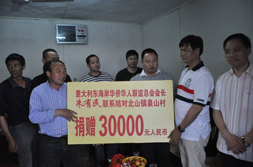 中新網5月28日電 據(jù)青田縣僑聯(lián)消息,5月26日,浙江省青田縣委常委、縣委辦公室主任楊雷陪同青田籍華僑、意大利東海岸華僑華人聯(lián)誼總會會長朱有民,來到聯(lián)系其結對的北山鎮(zhèn)肖山村和泉山村,分別向兩村各捐贈3萬元共計6萬元,用于改善村莊的基礎設施建設。