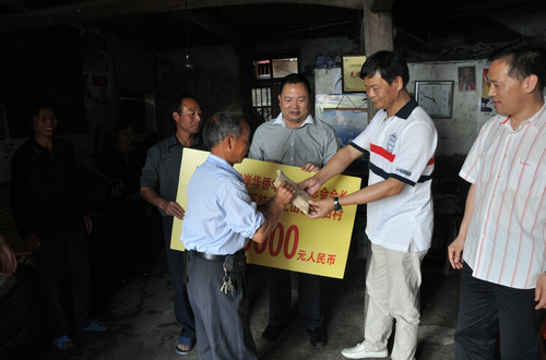 楊雷、朱有民一行人先后來到兩村,跟村兩委人員親切交談,了解村里的基本情況。肖山村全村800多人,有160多人留守在家,村民們主要收入來源就是稻田養(yǎng)魚和油茶培育。而泉山村全村也就70多戶村民,經濟來源單一,生活生產困難。座談會上,村干部們就如何發(fā)展該村經濟效益而暢所欲言,同時也提出了由于地處偏遠,經濟發(fā)展不起來,資金不足而導致至今沒有一幢像樣的村委大樓等困難和問題。朱有民在了解情況后,毫不猶疑地向兩村各捐贈了3萬元人民幣,用于村委大樓的建設,并表示以后村里如果有問題和困難,他都會一直關注和支持的。