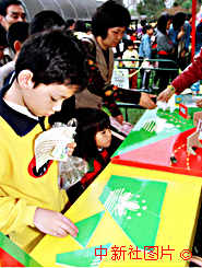 一名兒童在"喜迎澳門回歸,共創(chuàng)美好明天"園游會(huì)上認(rèn)真地拼裝澳門特區(qū)區(qū)旗圖案。澳門為紀(jì)念澳門基本法頒布六周年,于二十八日開始舉行系列活動(dòng),以增強(qiáng)人們的回歸意識。