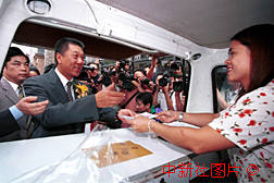 澳門特別行政區(qū)首任行政長官何厚鏵三十一日在街頭郵政車前,為澳門回歸倒計時五十天紀(jì)念郵封加蓋郵戳。