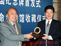 由香港著名設計師宣小英設計的"澳門回歸紀念牌",三日在北京由發(fā)行單位中國安徽國際經(jīng)濟技術合作公司將"0001"號捐獻給中國革命博物館作永久收藏。