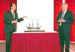 瑞典駐港領(lǐng)事祈榮富先生(右)九日在澳門將一艘十八世紀(jì)商船模型贈(zèng)送給澳門旅笴娛樂有限公司董事總經(jīng)理何鴻(上焱下木)博士。這艘名為“高登堡”號(hào)的商船隸屬瑞典東印度公司,曾於一七三二年至一八零六年三度來華貿(mào)易,并停泊澳門。