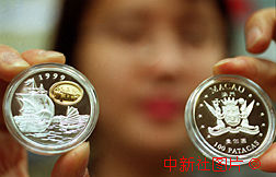 99北京國(guó)際錢幣博覽會(huì)十一日開幕,來自二十多個(gè)國(guó)家和地區(qū)的近七十家廠商展示了各自的錢幣精品。圖為"加拿大皇家造幣廠"為澳門回歸中國(guó)而發(fā)行的精鑄紀(jì)念銀幣(正反面),出售價(jià)為680元,發(fā)行38888套。