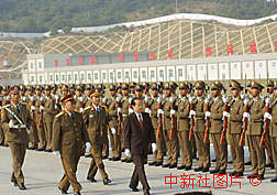 解放軍駐澳門部隊19日公開亮相,國務(wù)院副總理、澳門特別行政區(qū)籌委會主任委員錢其琛在廣州軍區(qū)司令員陶伯鈞和駐澳部隊司令員劉粵軍陪同下,在駐澳部隊珠;貦z閱駐澳門部隊儀仗隊。