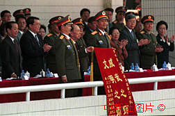 全國政協(xié)副主席、澳門特區(qū)籌委會副主任委員馬萬祺十九日向解放軍駐澳門部隊贈送書有"威武之師文明之師"的錦旗。
