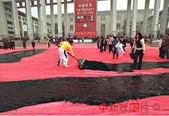曾獲吉尼斯世界紀錄的中國巨書書法家孫鑫,二十三日在北京天安門廣場澳門倒計時牌前,用巨筆書寫一個九百九十九平方米的巨大“龍”字,該作品將運往澳門展出。作者:宗金柱