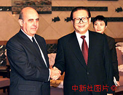 國家主席江澤民二十三日在北京人民大會(huì)堂會(huì)見澳門總督韋奇立。作者:李剛