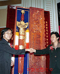 為慶祝澳門回歸祖國(guó),河南省旅游局與登封市人民政府將一柄制作精良、重五十斤的特大型少林寶劍贈(zèng)送給澳門人民。圖為河南省旅游局副局長(zhǎng)方洪蓮(右)向澳門政府旅游司代司長(zhǎng)文綺華贈(zèng)送寶劍。