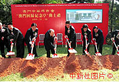 澳門中華總商會(huì)建造"澳門回歸紀(jì)念亭" 中新社傳真 毛建軍 攝 澳門中華總商會(huì)建造"澳門回歸紀(jì)念亭"動(dòng)土儀式三十日在澳門何賢公園舉行,澳門特區(qū)首任行政長(zhǎng)官何厚鏵(左五)、澳門中華總商會(huì)會(huì)長(zhǎng)馬萬(wàn)祺(左四)、新華社澳門分社副社長(zhǎng)宗光耀(左三)等嘉賓出席。  |
