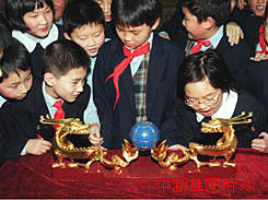 為慶祝澳門回歸,迎接新世紀的到來,北京二十一世紀實驗學校的師生,一日舉行喜迎巨型雕塑「中華正氣龍」抵京 儀式。圖為學生們正在聚精會神的觀賞一對小型中華正氣龍雕塑。