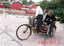 許多外國游客回歸前親臨澳門,乘坐獨(dú)特的人力三輪車觀賞葡萄牙當(dāng)年登上澳門的媽閣廟。中新社傳真